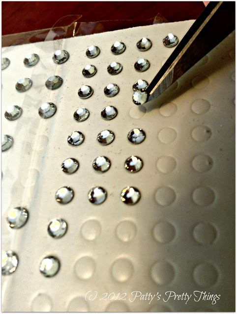 Then I and added rhinestones for the diamond rings. I used the tip of my scissors to pick the rhinestones off their paper and apply them to the diamond part of the stamp on the pink paper.