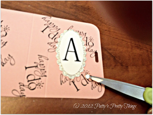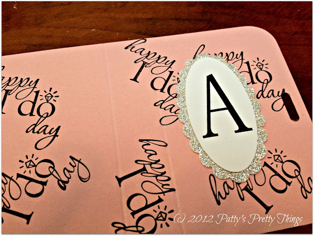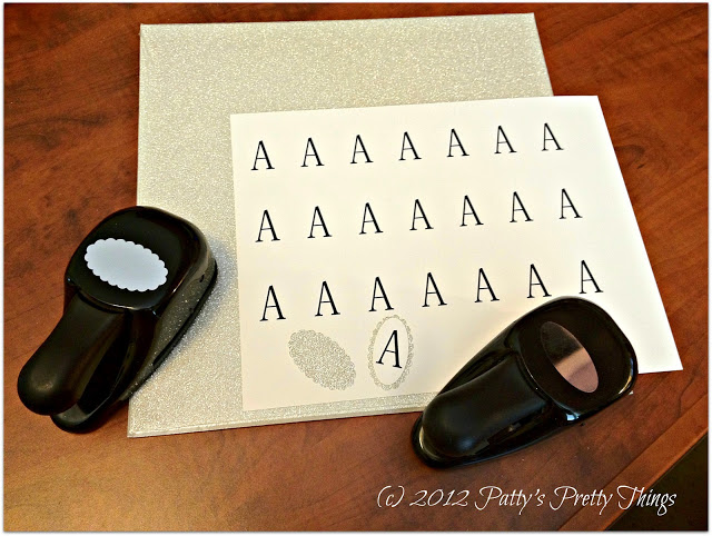 I made a page of the monogram on the computer and printed it off on a sheet like this. Then I punched them out with this oval punch and punched out a larger scalloped oval from silver glitter paper. I attached the two together with mini glue dots.