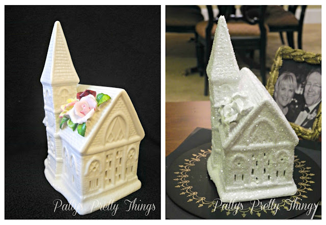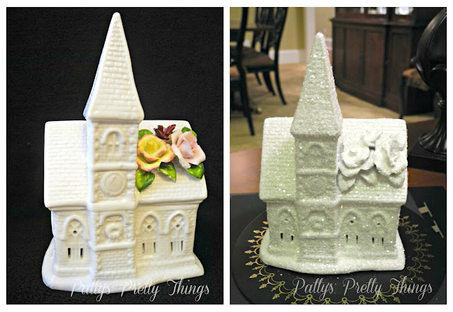 Here are before and after photos of my glittery church: