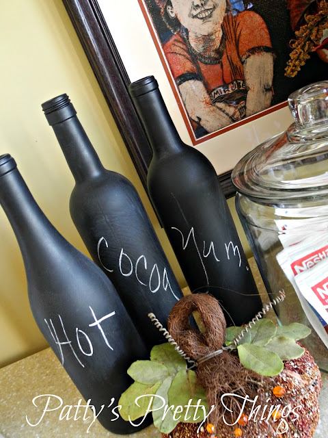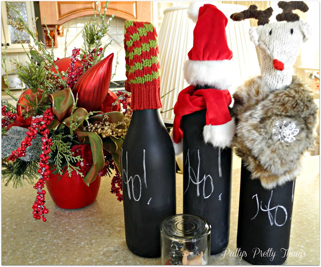 I am just crazy over chalk board paint and wanted to have something to write on in the kitchen. I had sprayed these wine bottles and had fun with them over the holidays with their clothes.