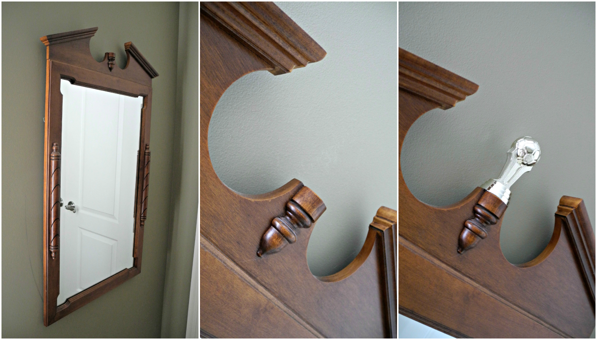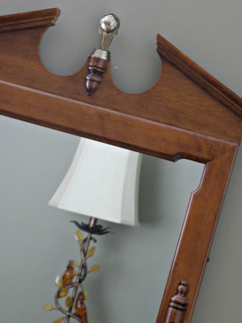 I unscrewed the soccer ball ornament and put it on this mirror I cherish from my childhood home. The mirror, which hangs in our guest room, originally had an eagle on it (as most things did in my parents' home). I removed the gaudy eagle long ago and had been keeping my eye out for some thing to replace it.