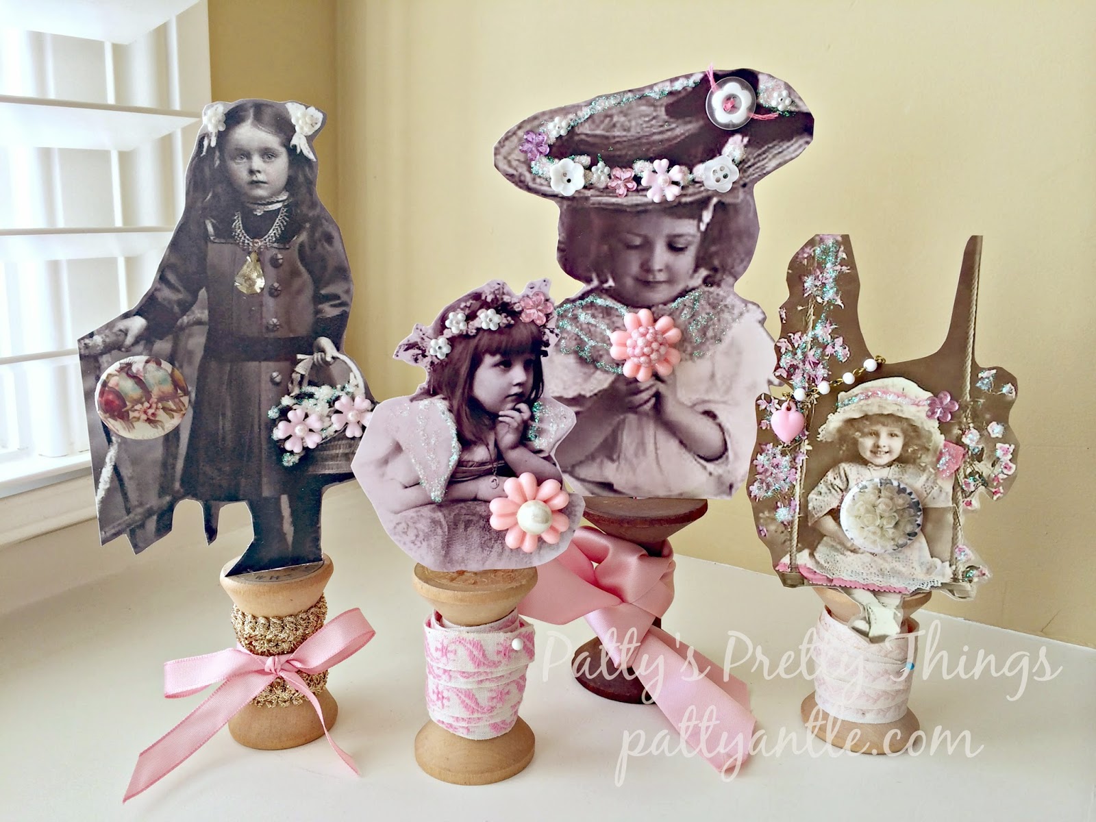 This year, I've developed a fondness for making spoolies for the holidays. It started with the Valentine's Day swap. Then I made a St. Patrick's day spoolie. So when I was asked to be in a spring spoolie swap, I decided to make a bunch since it's so much fun embellishing vintage spools and photos.