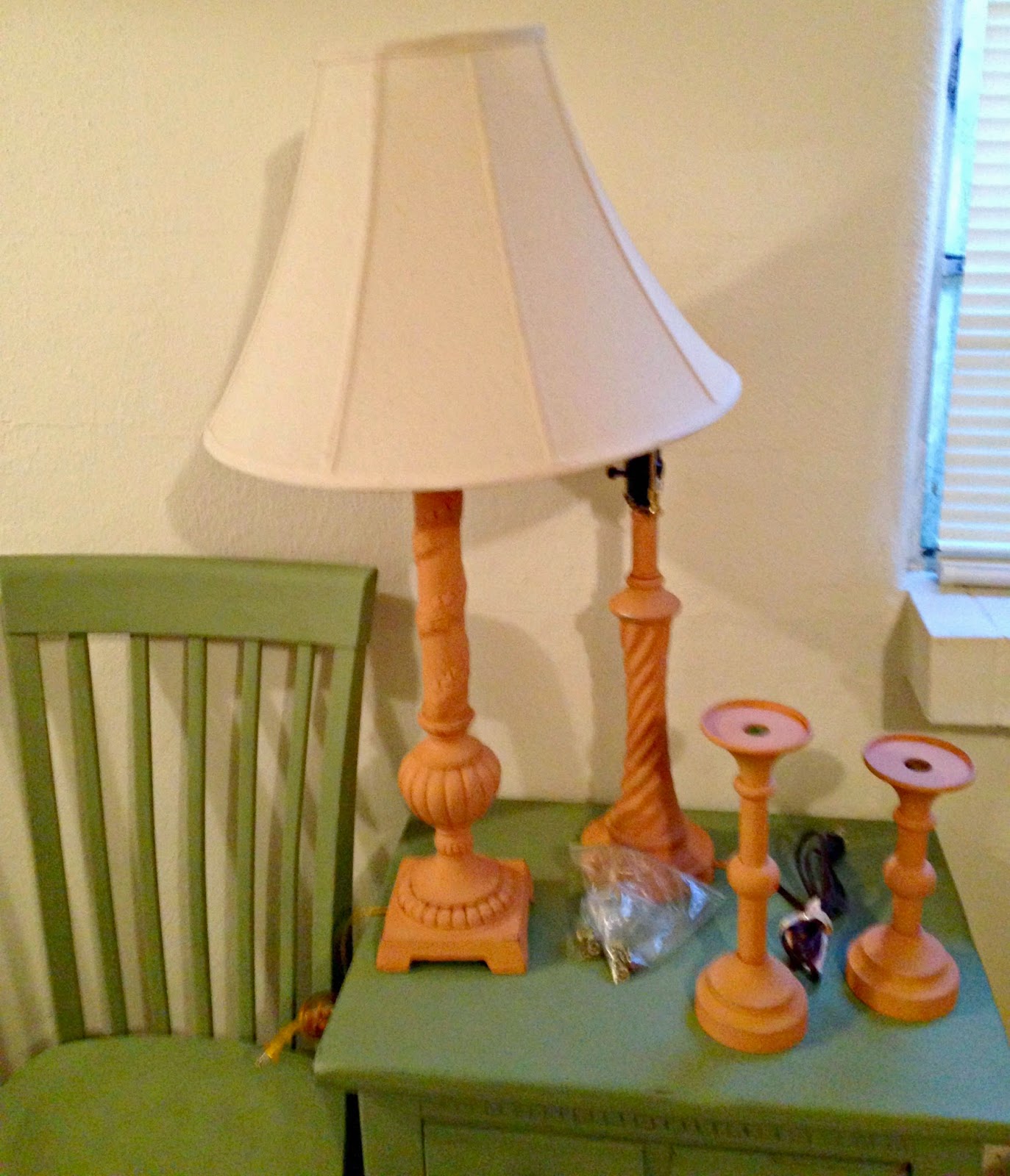 Lamps and candle sticks were painted with MB Creole Orange and the chairs with Mardi Gras. An EA bedside table was painted with Mardi Gras as well.
