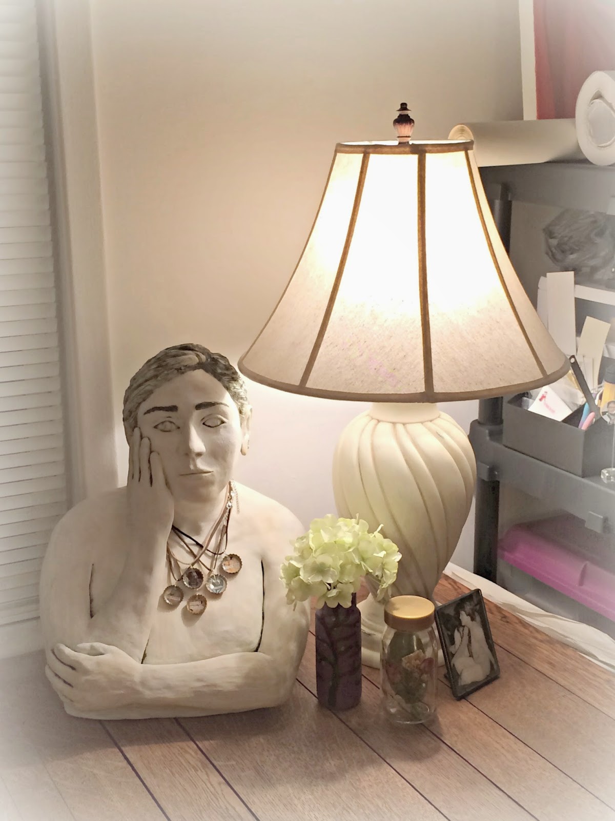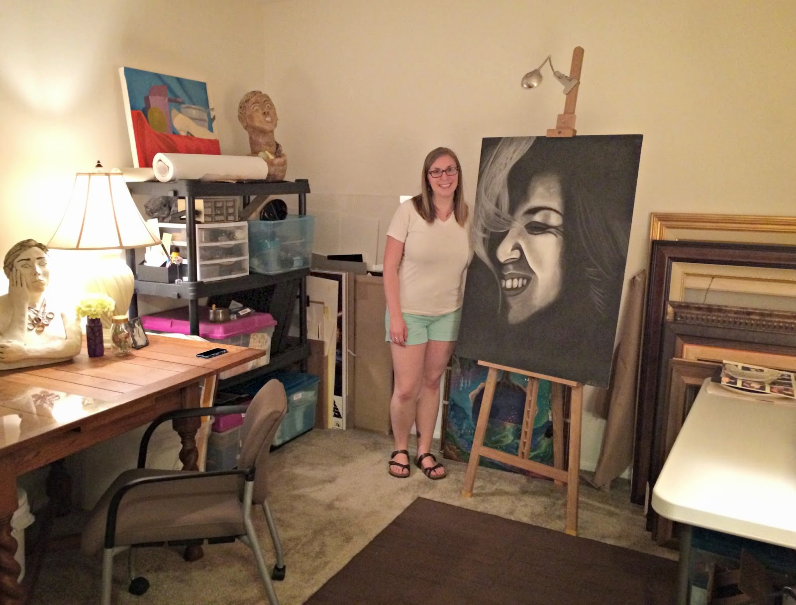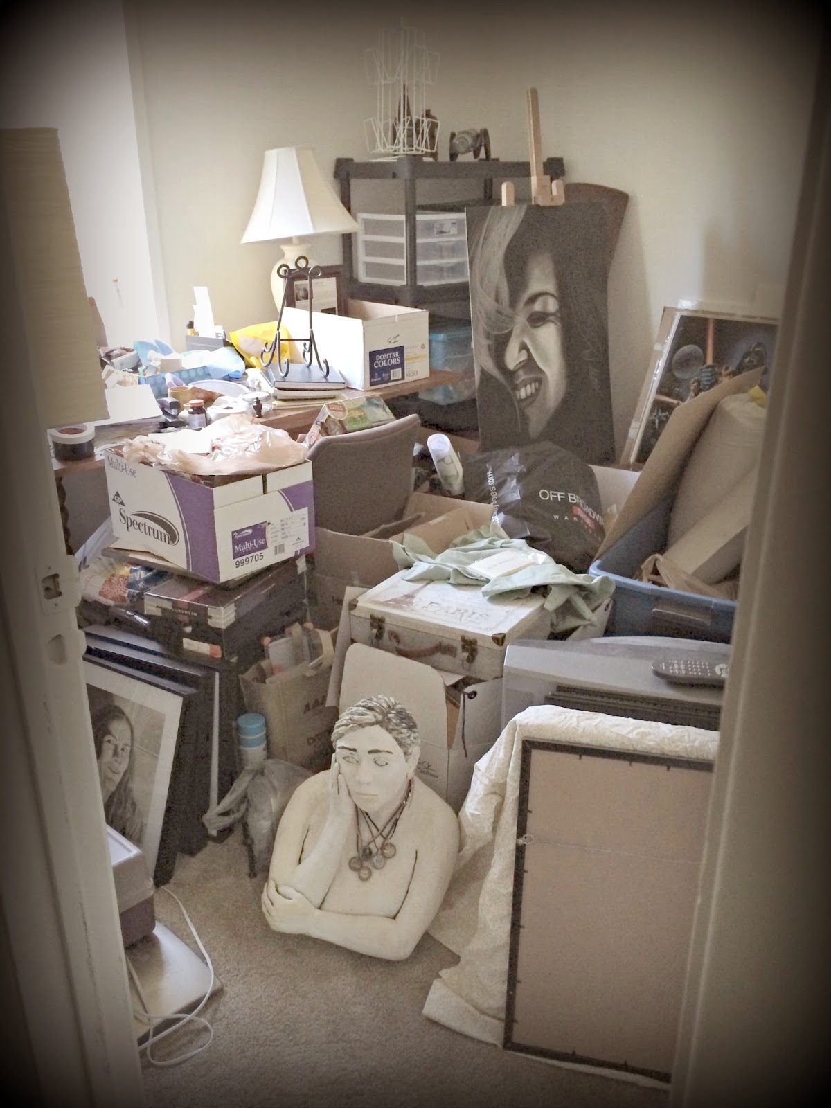 Just this past weekend, Ash asked me to help her organize the second bedroom which was meant to be her art studio. Oh my! Her statue at the bottom of the pic has the right expression here!
