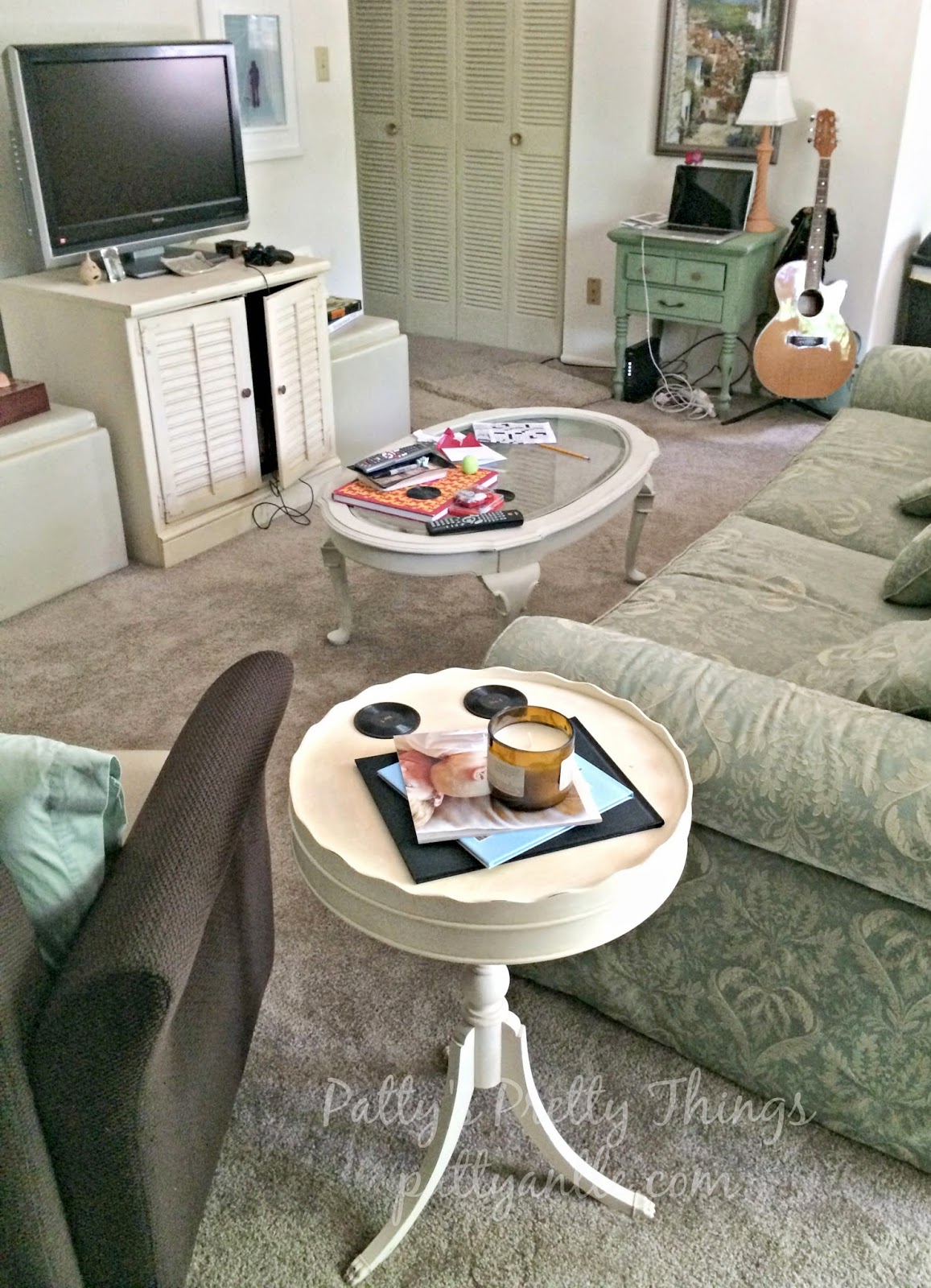 Here you can see the TV cabinet in use along with other pieces we painted.