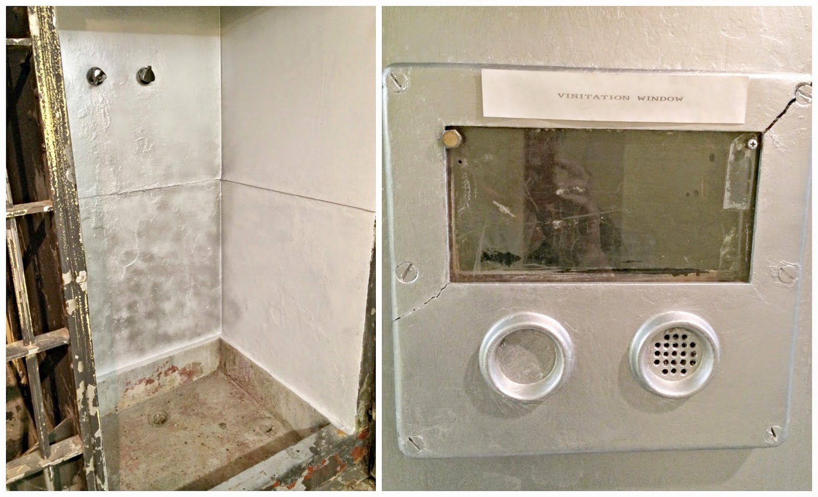 Now, onto the jail...The bottom left photo shows the door to the entrance of the "book-in" room. The center photo is the book-in room and the right photo is the entrance to the jail.