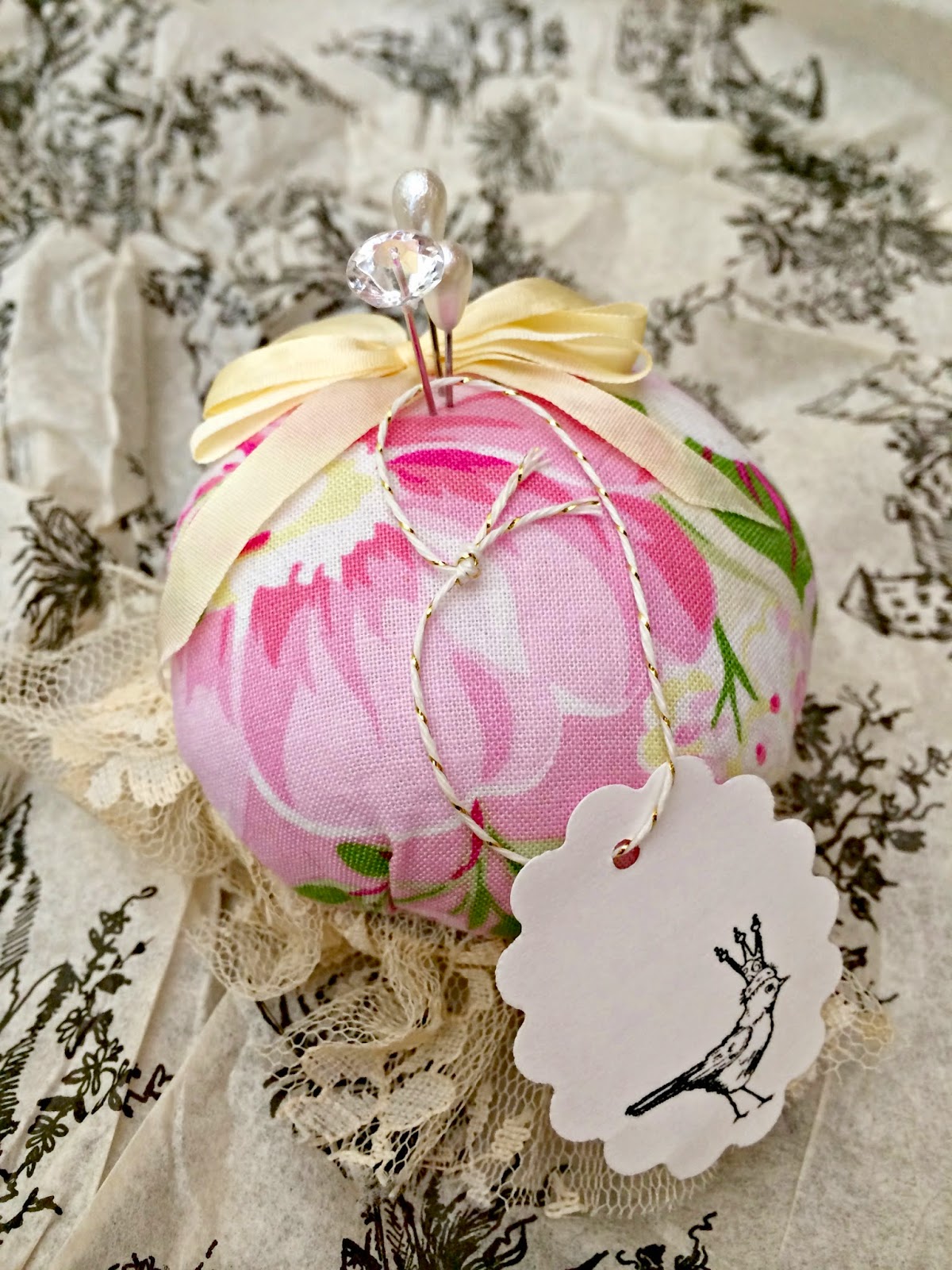 Then I won a pincushion from Christine Barker of Scarlet Calliope. She was celebrating her 125th post. I met Christine at An Affair at Downton in May. She was one of the amazing artists that I met there. She recently had a fabulous booth at a flea market - you can go here to check it out.