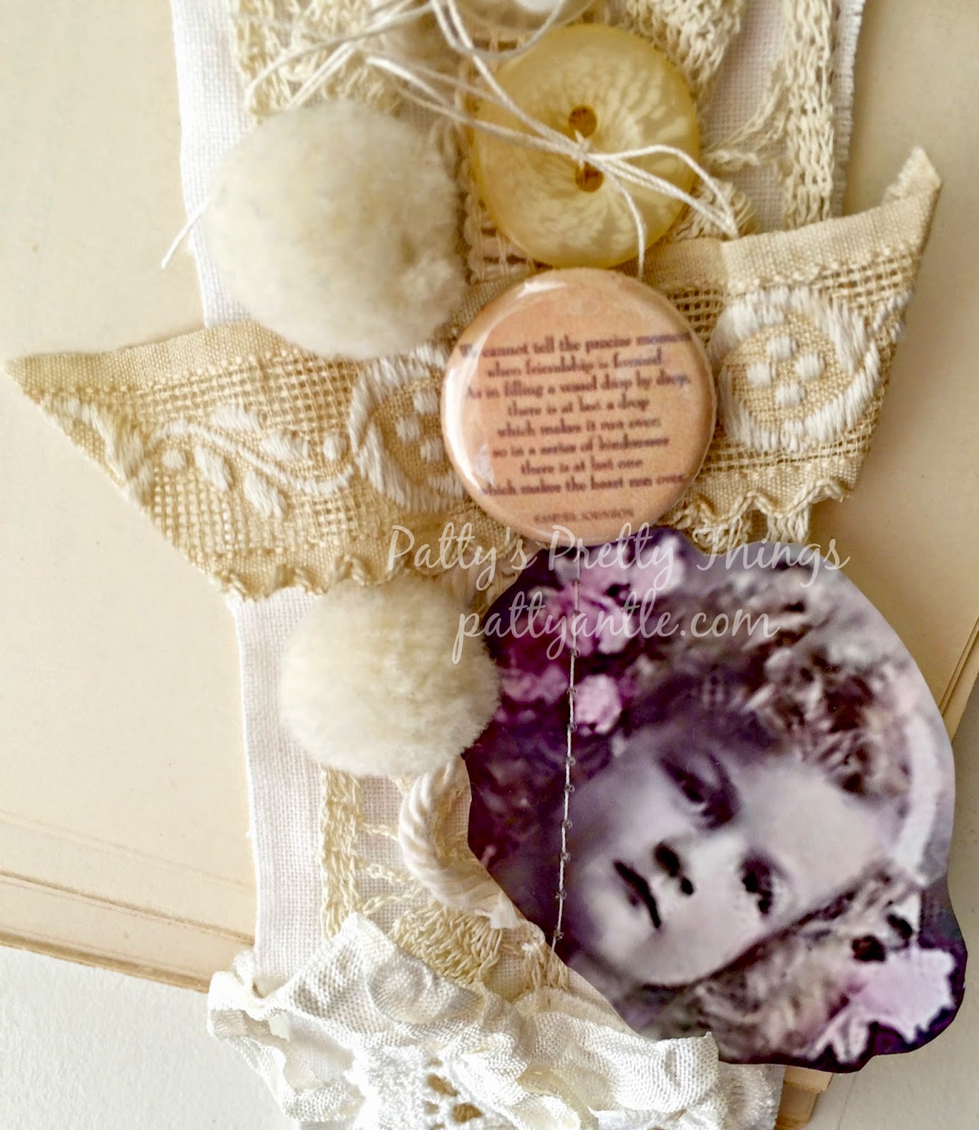 Bits of lace, trim, brads and buttons I made with my one-inch button machine were used to embellish the piece.