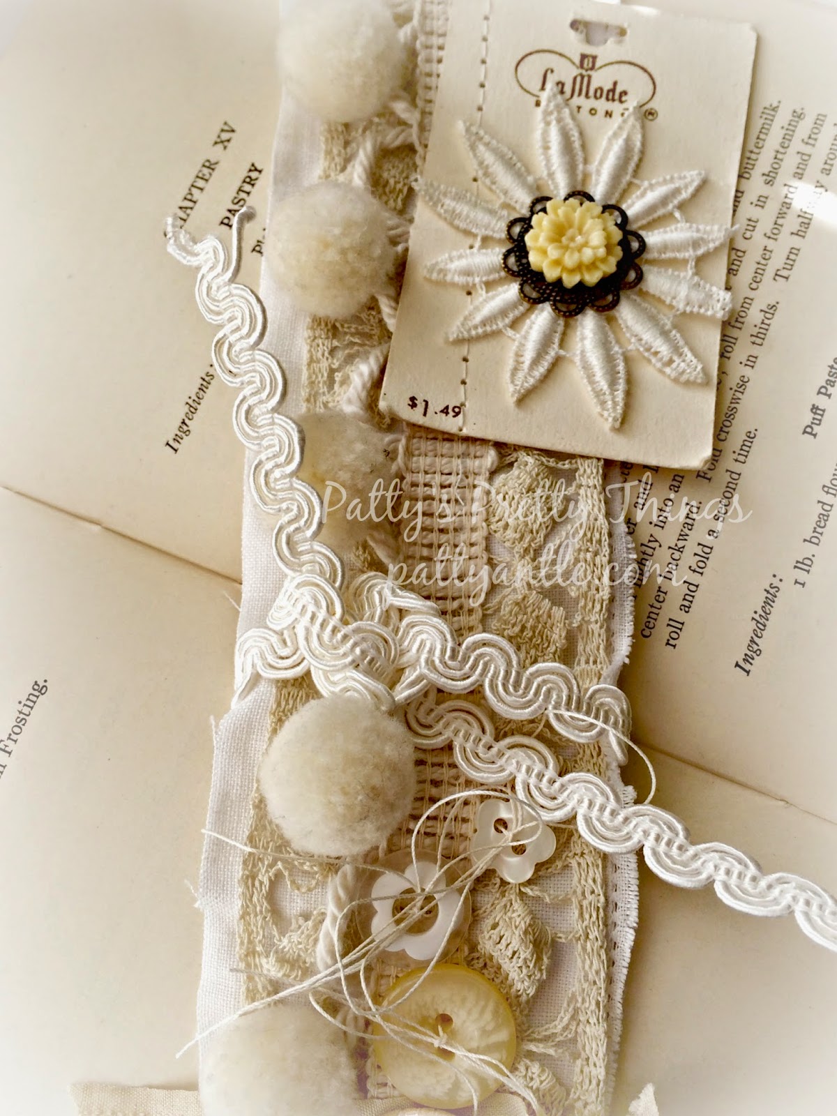 I was invited to join in on Heidi Meyer's (Sugah Beez) Vintage Darlings Snippet Roll Swap. A snippet roll is a compilation of bits and pieces of vintage embellishments attached to a narrow piece of fabric that can perhaps roll onto an old wooden spool. It was something new to me and once Heidi sent me a link to see some examples, I got really excited about making one for my swap partner, Gypsy Rose.