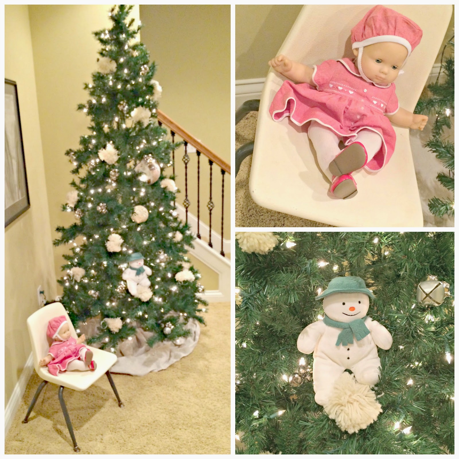 Since I knew they wouldn't be with us for Christmas, I put up a tree and brought out some festive decorations. To keep the tree simple and safe, I scattered giant pom pom yarn ornaments, clusters of various sized jingle bells, two handmade glitter ornaments and a snowman on the tree. The snowman would greet LG at eye level. As it turned out, they all loved the decorations and LG had a great time carrying around the snowman and using his pointer finger to jingle the bells on the tree.