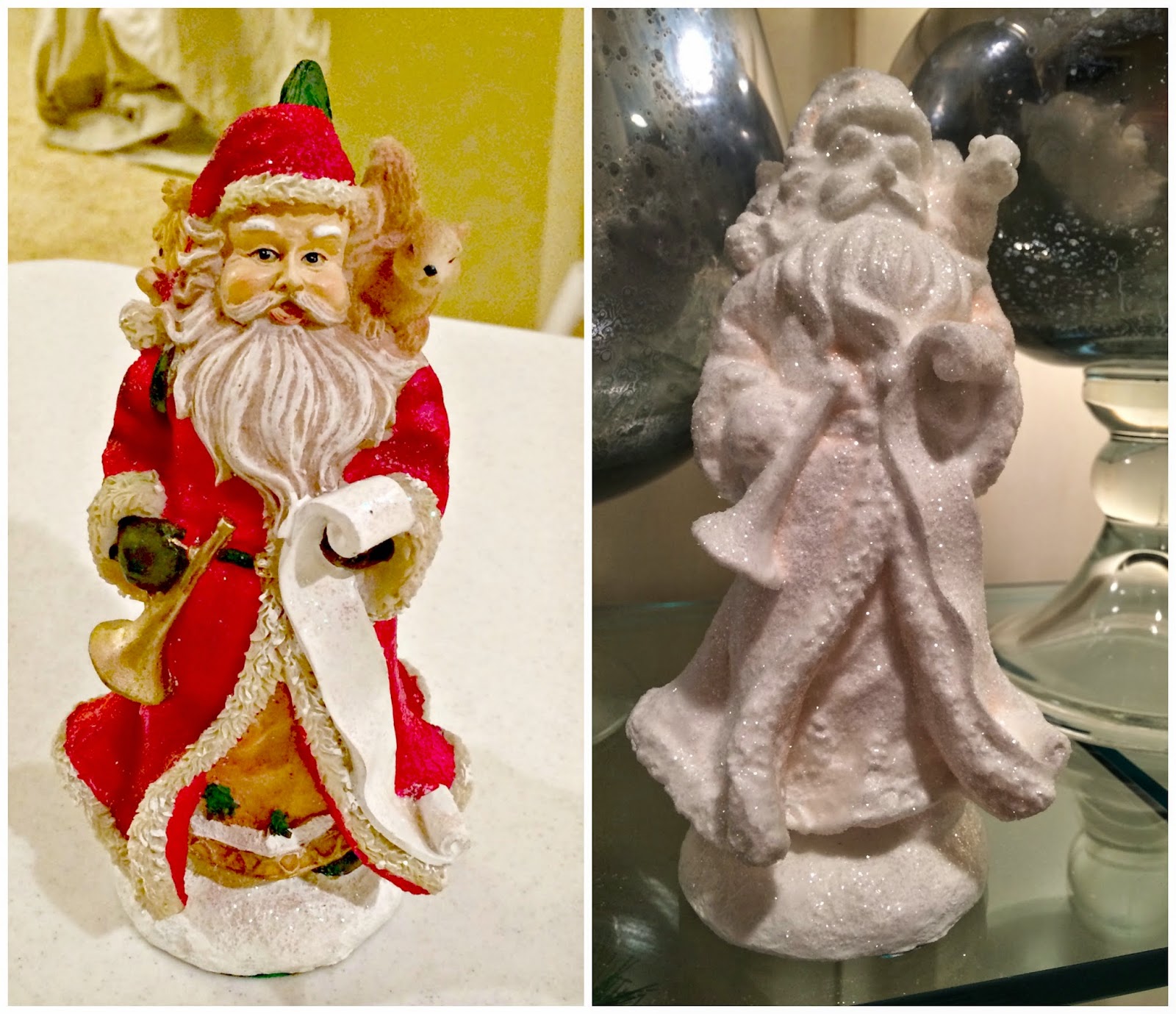 I saw the idea of "sugaring" a Santa on Jennifer Rizzo's blog here. First, I painted the Santa all white but it took several coats of white craft paint, then a coat of primer, then more craft paint to cover the red. I didn't think I'd ever get to sugar him - it was a lesson in patience. I do love the results.
