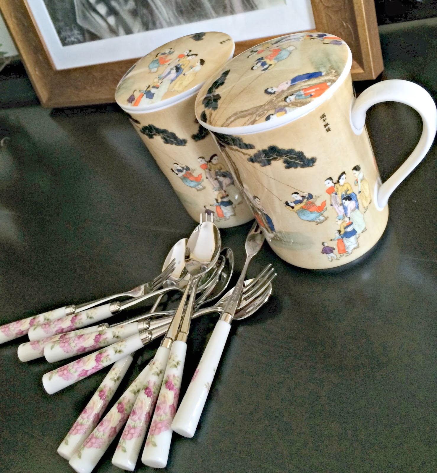 Dan brought home some beau-tea-ful mugs and porcelain utensils from a business trip. They were given to him as a gift from one of his Korean colleagues.