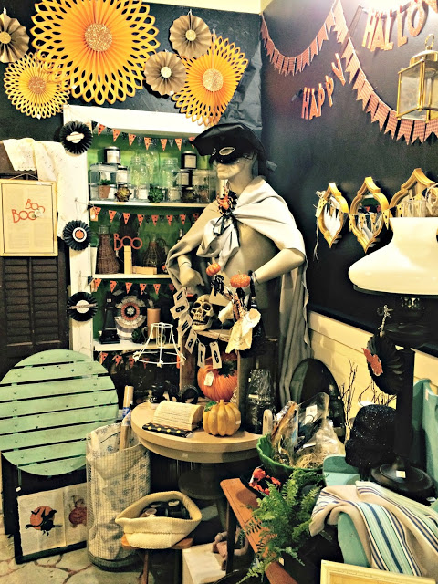 My friend, Karen, who has a booth at the Logan Village Mall in Noblesville, does an amazing job staging her booth. She had been talking about painting one of the areas with black chalkboard paint and recently did just that. Note how it brings out all of the beautifully rich colors of the items that she has for sale.