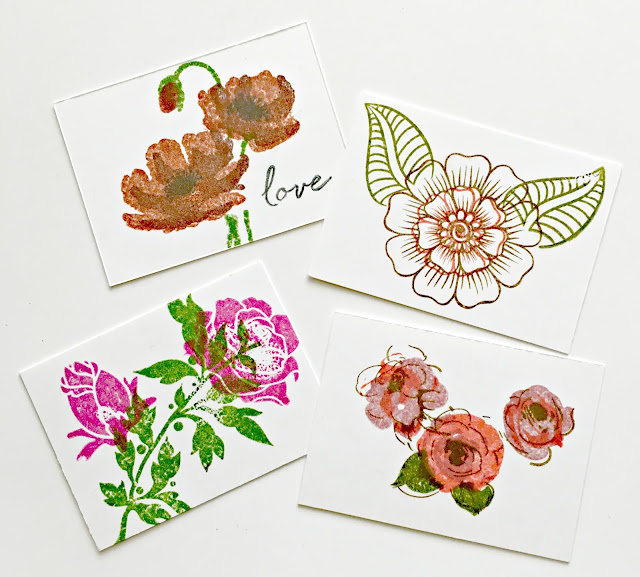 April's art class was enjoyable as always. This time we practiced layering with stamps. Here are the pieces I made that day.