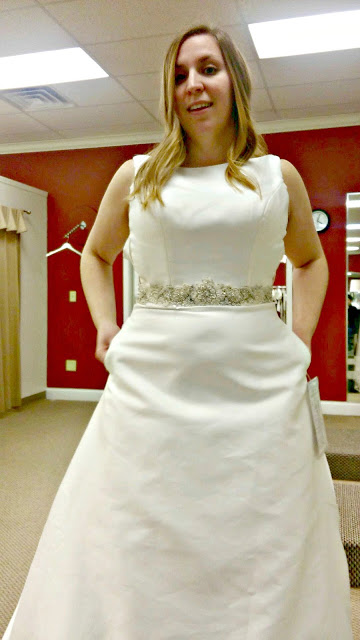 The first thing we did was to visit a bridal shop. We wanted the experience of her trying on bridal gowns to see if the style she liked looked good on her. (I also wanted to make sure that she wanted me to sew the dress - wouldn't it be easier to purchase one?) She immediately gravitated to this dress. This is what she wanted, a simple A line dress. Well, it looked simple enough, right?! No frilly lace to work around. "Why can't we purchase this one?" I asked. She said that she wanted the skirt to be another color, like beige or blush. "No store will have what I want," she said. "So you need to sew it for me." Well, ok then.