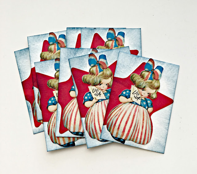 This month I drew on a patriotic theme for my artist trading cards. I used one of my favorite graphics from The Graphics Fairy blog of this little patriotic girl, put a die cut star behind her and sponged the edges with blue ink.