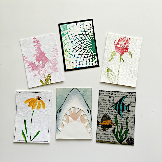 Gosh, September is almost over and I am just getting this month's art class blog post published! I have been very busy getting ready for our daughter's upcoming wedding. I missed posting last month because we were out of town. Well, here is what I have...artist trading cards from my pals for July's lesson which was on watercolor.