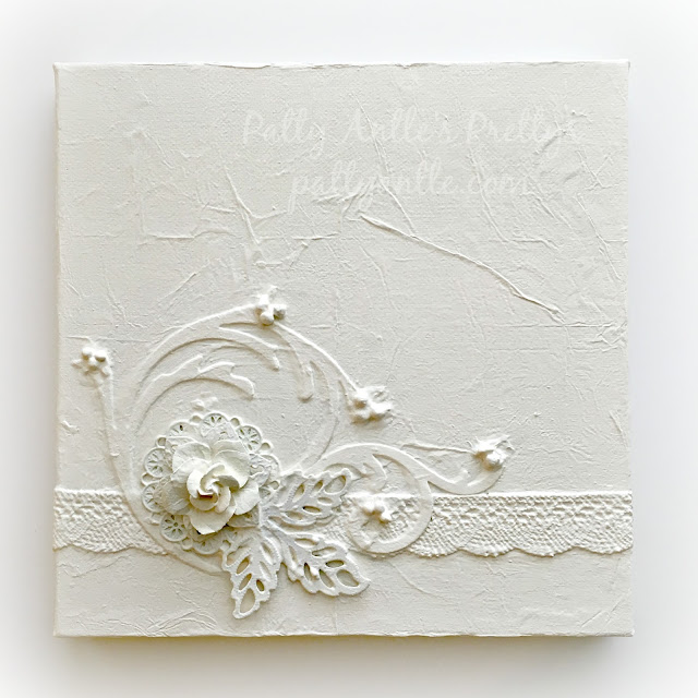 This month our instructor taught us about Prima art products. We applied metal objects, lace, sewing pattern pieces, gesso, texture paste and paint to a small canvas. When I saw the model piece, I immediately thought "wedding"! This is how mine turned out! I love how the sewing pattern piece created a nice textured background.