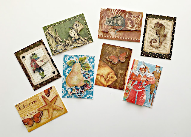 Here are the artist trading cards I made to share with the group. Since the topic from last month was Graphic45 "fussy cut", we were to practice more of that through our trading cards. We used cardstock produced by the Graphic45 company and cut with a small scissors at least two layers of the same image to give dimension. The layers were held together with foam adhesive.