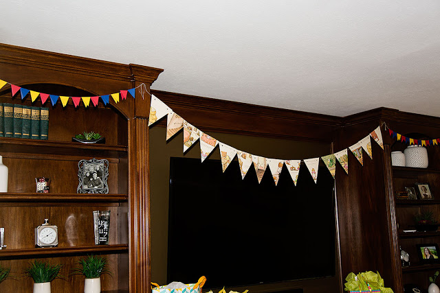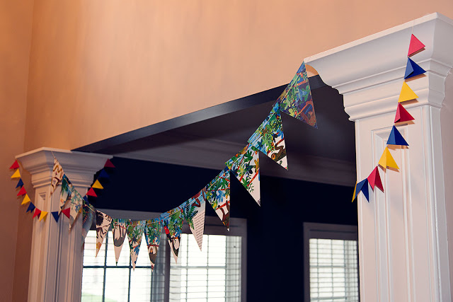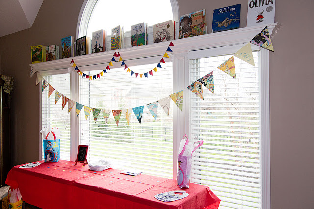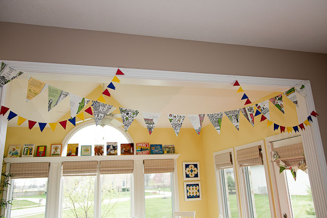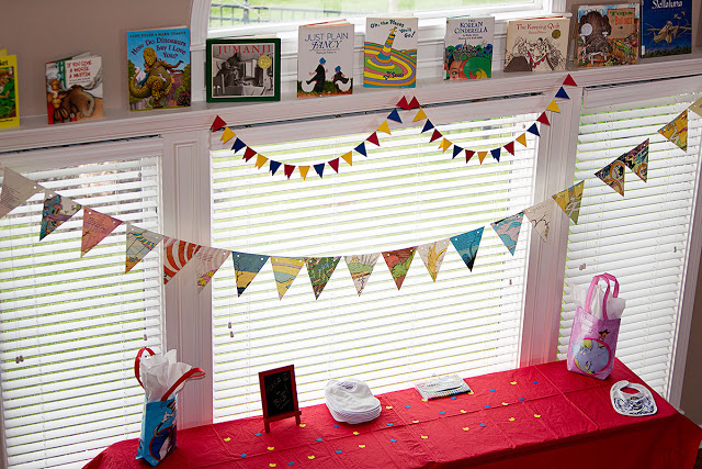 For the other baby shower, a children's storybook theme was carried out with banners cut from various storybooks. Smaller banners were cut from primary colors.