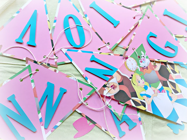 For the Alice in Wonderland banner, I cut pieces from a children's book