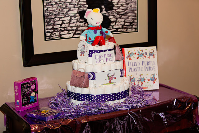 For this shower, the hostess wanted to add some purple accents because the mom-to-be loves purple. She made this diaper cake, an inspiration from the story "Lilly's Purple Plastic Purse."