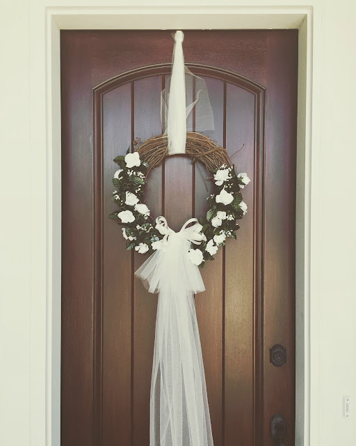 The Pinterest inspired wreath on the front door was made with a grapevine wreath, rose garland, tulle and ribbon.