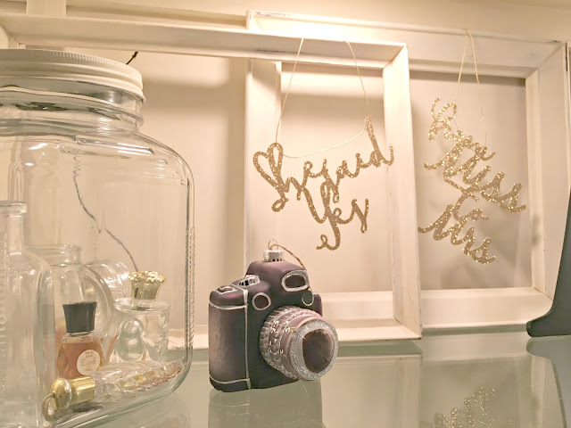 Other glitter signs hang amid vintage bottles in an old jar with a Christmas camera ornament from Pottery Barn.