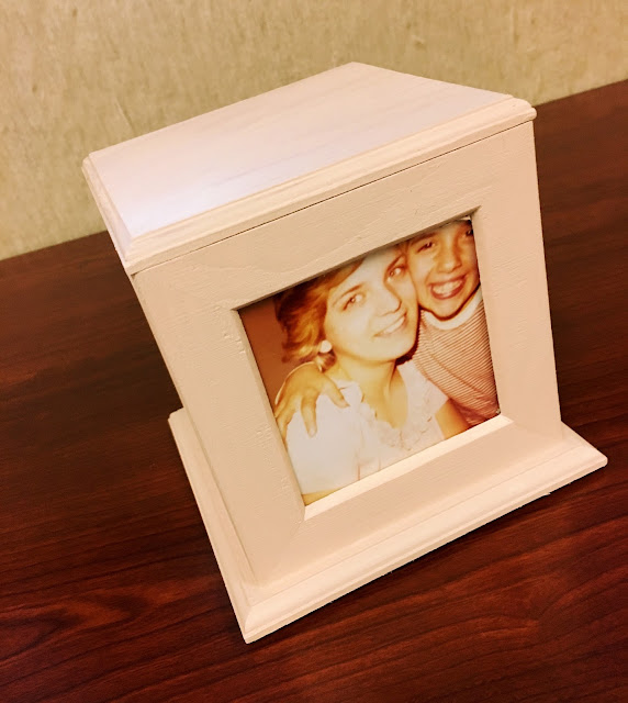 Last evening I attended a craft event at the local library. It was to make this spinning photo cube for Mother's Day. We were told to bring 4 photos that were 3 3/8 inches square. Of course I waited until the last minute to find my photos. So I got out a box of random photos and found 4 oldies but goodies. They seemed to coordinate well together so I decided to give them a try. Also, they were already 3 3/8 inches square. That's the size that photos used to be when I was a kid.