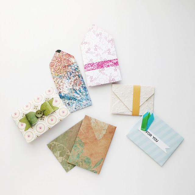 Here are artist trading cards I received from my friends. Since we made envelopes with the Envelope Punch Board last month, our trading cards reflected what we learned from that. So our trading cards this month were little envelopes with notes inside.