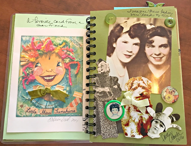 I created the first two pages scattered with green; a card from a dear friend, old photos and miscellaneous buttons and objects.