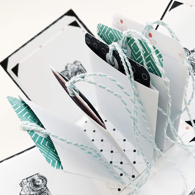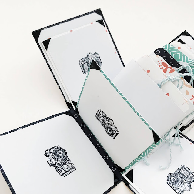 Photos can be added later by removing the white papers with cameras on them and inserting them into the photo corners.