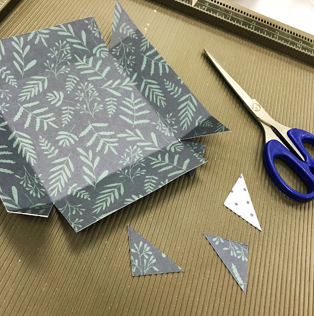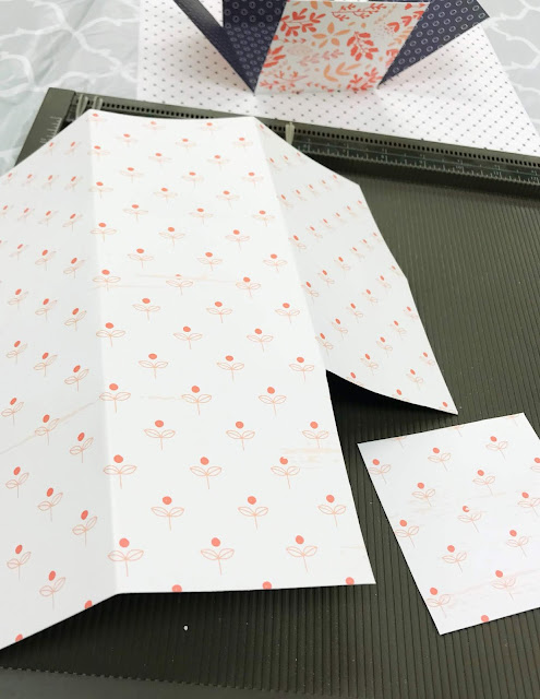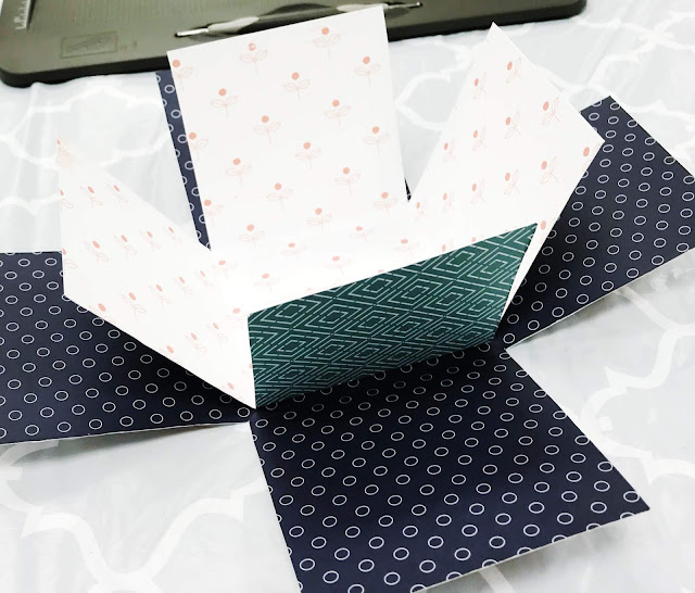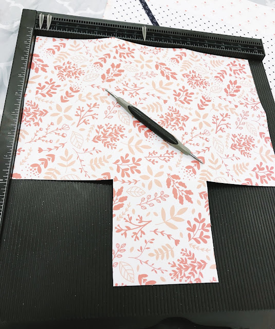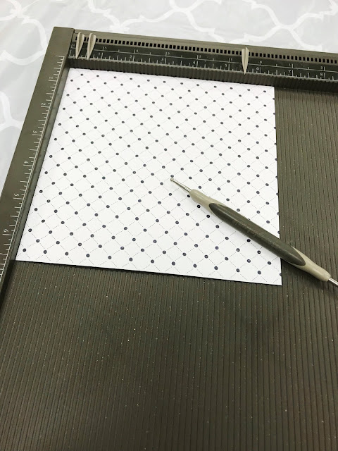 We started with two 12" x 12" pieces of heavy two-sided cardstock. After trimming the first piece and making fold lines with the scorer and stylus (seen below), we cut out the 4 corners.
