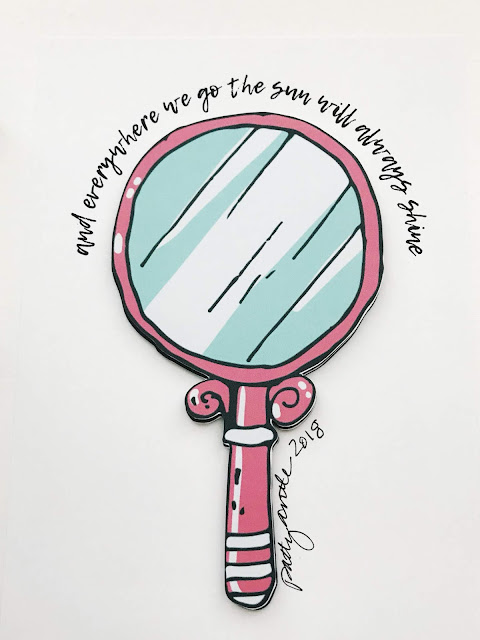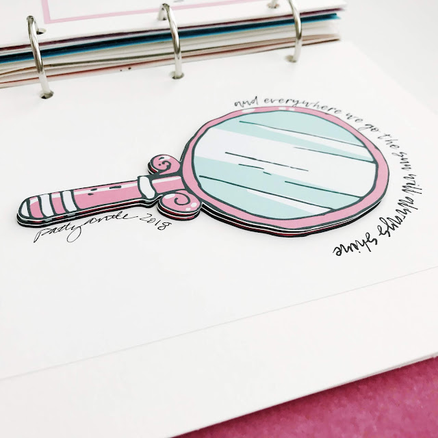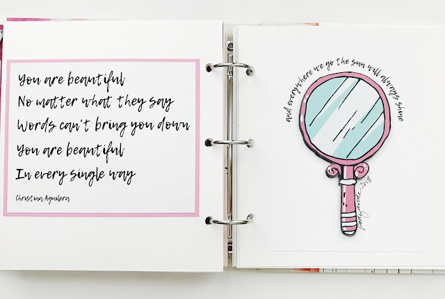 Each month we complete a page in a circle journal that belongs to a fellow member of the group. This month I was to make a page that included a positive saying. What came to my mind was Christina Aguilera's song "Beautiful". So I typed up some of the lyrics for the left page. On the right, I printed and cut a mirror with more lyrics "and everywhere we go the sun will always shine", so that my friend can see how beautiful she is.