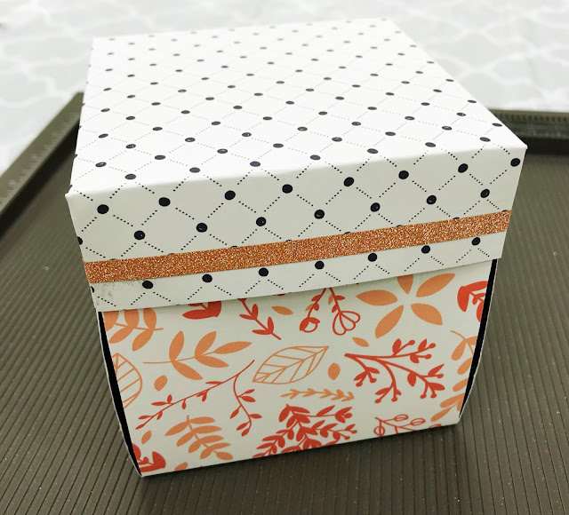 We put that part aside and made the lid (photo below). With a 6 1/2" x 6 1/2" piece of cardstock, we made score marks on it...