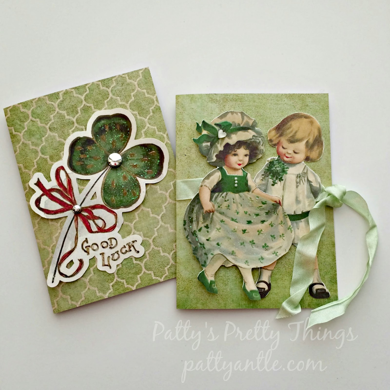 I made some cards with the St. Patrick's Day die cuts I listed in my Etsy shop. I added embellishments and glitter to the die cuts, and ribbon to the card on the bottom right. The shapes were cut with an electronic cutting machine.
