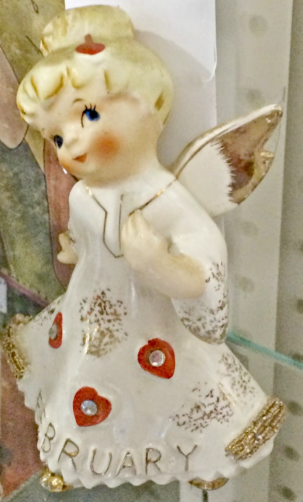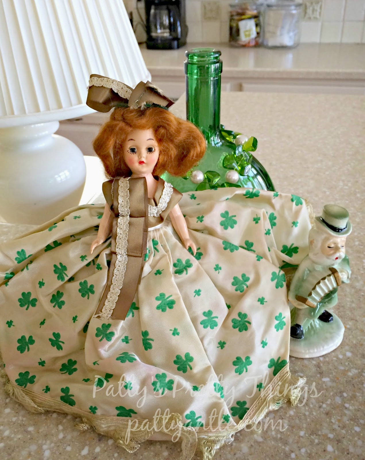 I have a little spot in our kitchen where I like to place seasonal vignettes. I was happy to find this vintage doll dressed in a shamrock dress and the little guy playing the accordion.
