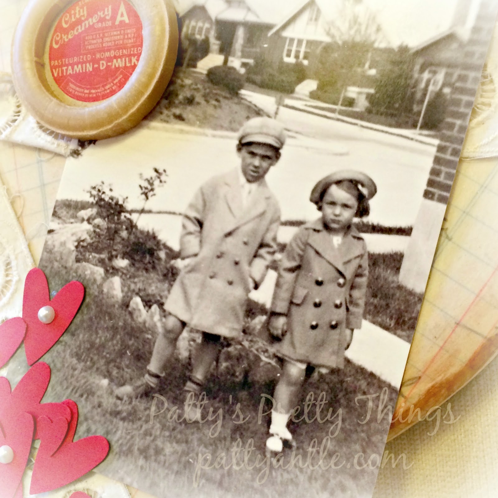 My friend Becky invited Missy and me to accept a mixed media Valentine's Day challenge. We were to decorate a heart. Her inspiration came from the Artsy VaVa blog here. I wanted to use this photo of my dad and his sister for my masterpiece.