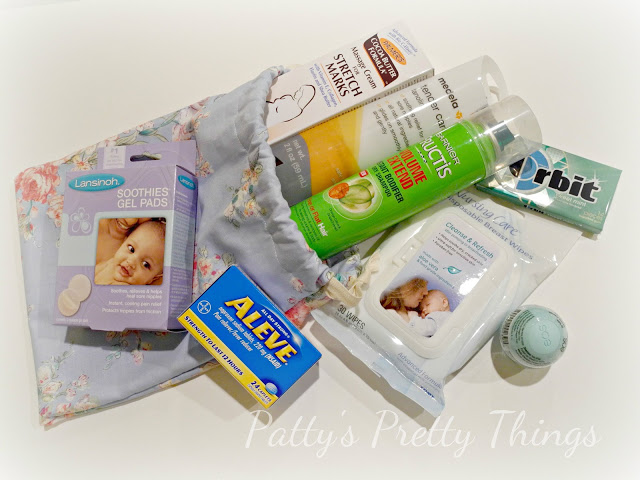 I loved this idea I saw on Pinterest of giving a Comfort Hospital Gift Bag to a new mother. So I sewed a little bag for our daughter in law and filled it up. It was so much fun sewing the bag and shopping for these special items to help her through the first few days of being a mommy.